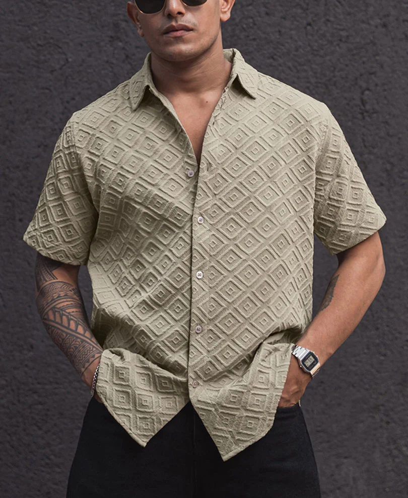 Upgrade your everyday look with our beige oversized shirts for men, crafted from premium fabric, featuring half sleeves and finished with an all-over diamond texture. The shirt’s oversized fit blends comfort and style effortlessly, making it perfect for casual hangouts or weekend outings when paired with baggy trousers.