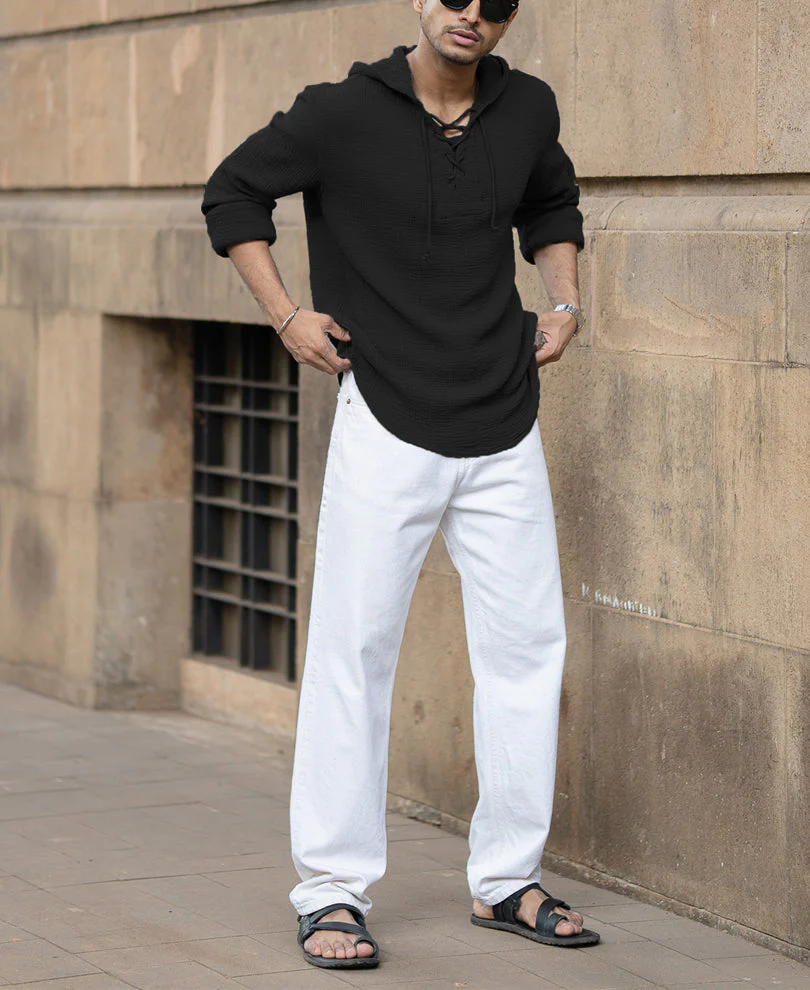 City-cool meets chill-core. The Black Crinkled Hooded Shirt is lightweight, laid-back, and made for low-effort days that still need high-style presence. With its relaxed hood, cross-tie neckline, and breathable structure, it???s a festival essential, a travel staple, or just your everyday ???don???t stress it??? fit.