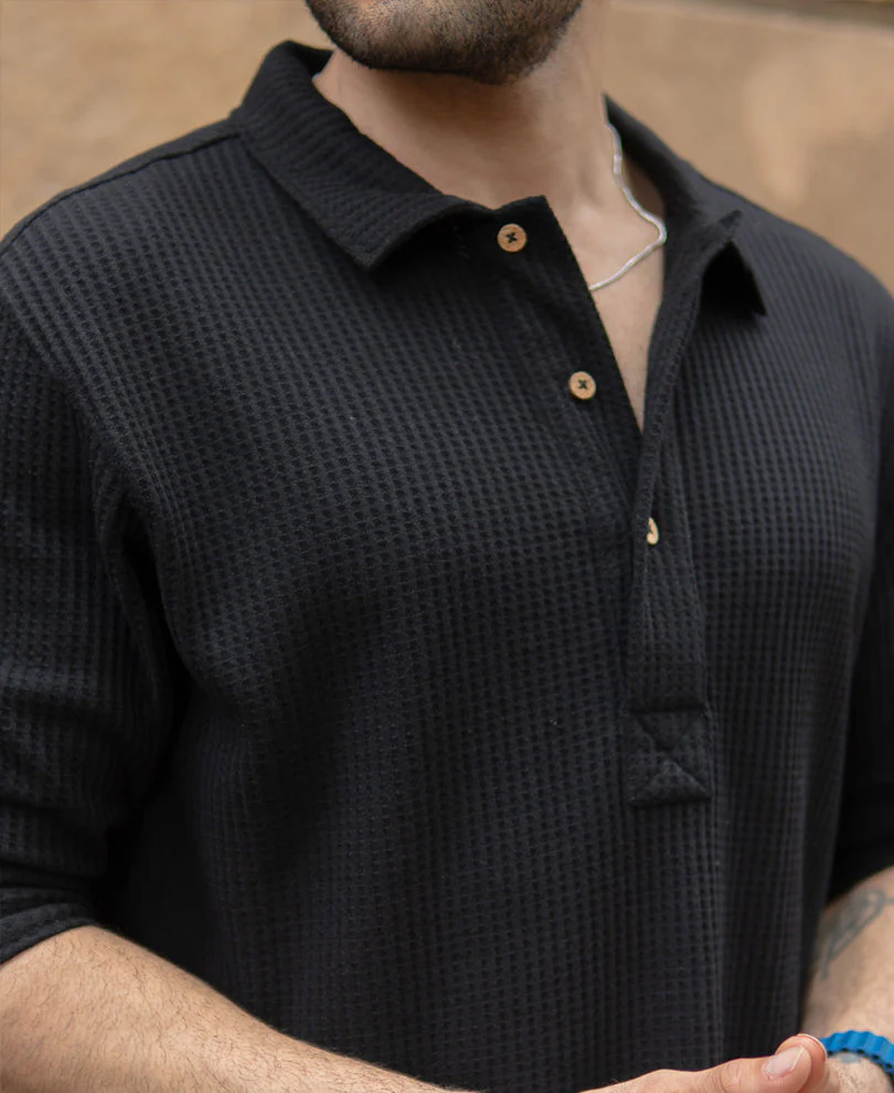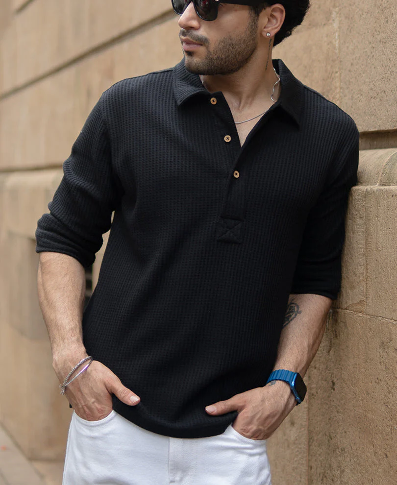 This one will never go out of style. A modern essential in jet black, this knit polo is clean, confident, and crafted to stay crisp through every wear. The ribbed texture adds tactile interest without distraction, while the polo collar keeps it firmly in the refined zone. Night-outs, casual Fridays, or smart layering; it adapts, effortlessly.