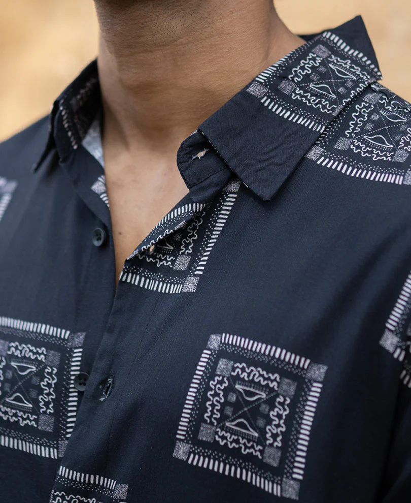 A relaxed fit and hand-block inspired tile print give this lightweight black shirt an old-world cool. Button it up with white trousers or leave it open over a vest???either way, it adds instant cultural cachet to your look.