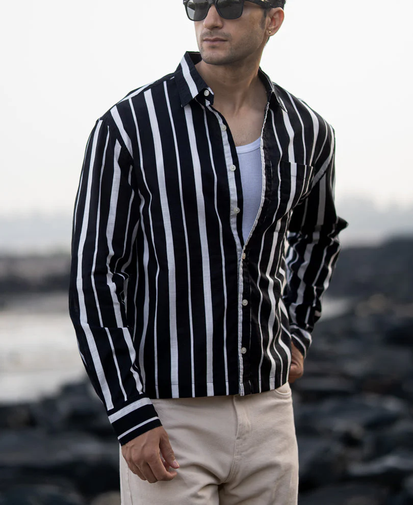 Make a bold yet effortless statement with this black lightweight striped shirt. Designed with crisp vertical white stripes, it offers a flattering, elongated silhouette that suits any occasion. Crafted from breathable fabric, this shirt ensures all-day comfort while keeping your style sharp. The button-down front and classic collar give it a timeless appeal ? perfect for both casual outings and smart-casual events.