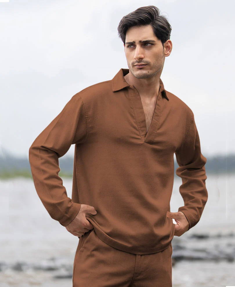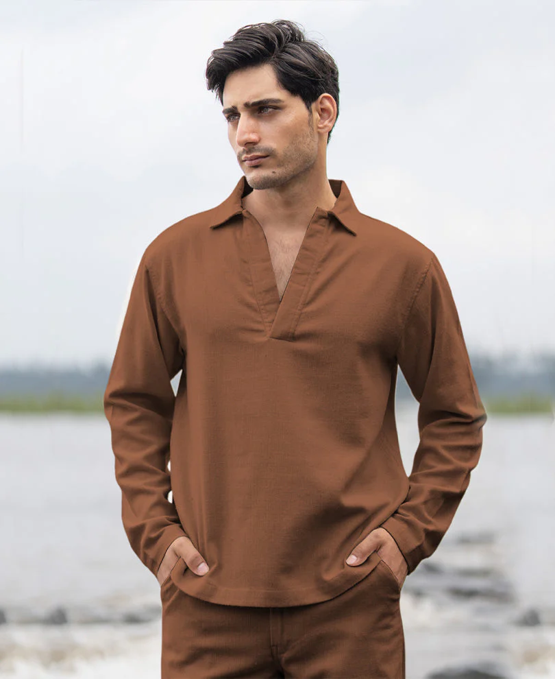 Brown Structured Cotton Kurta Shirt