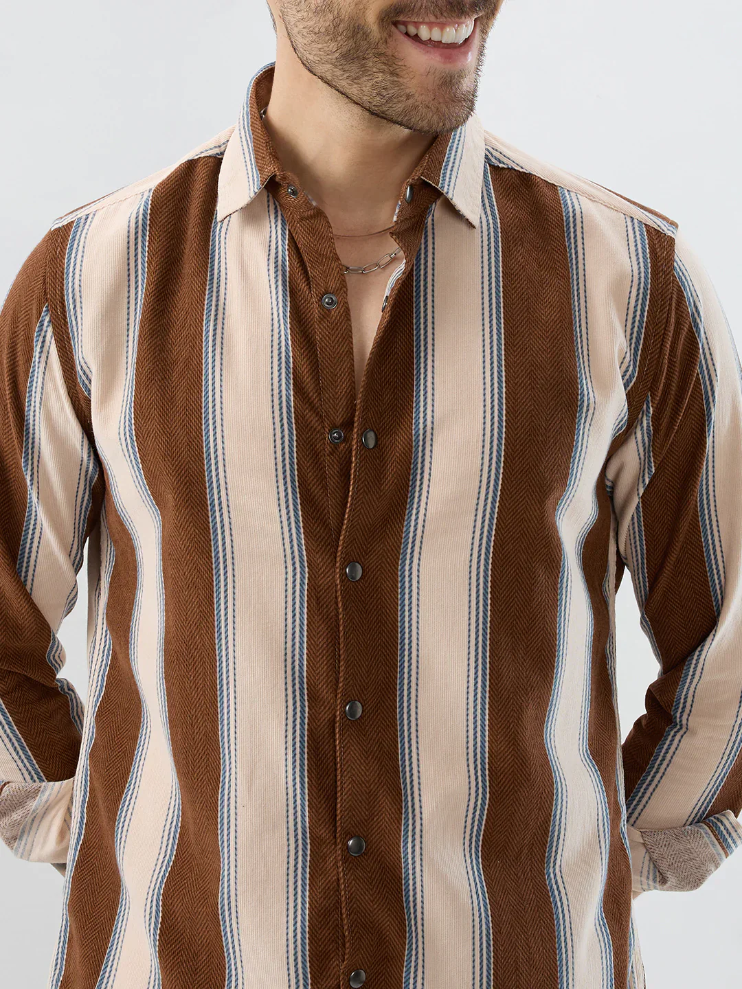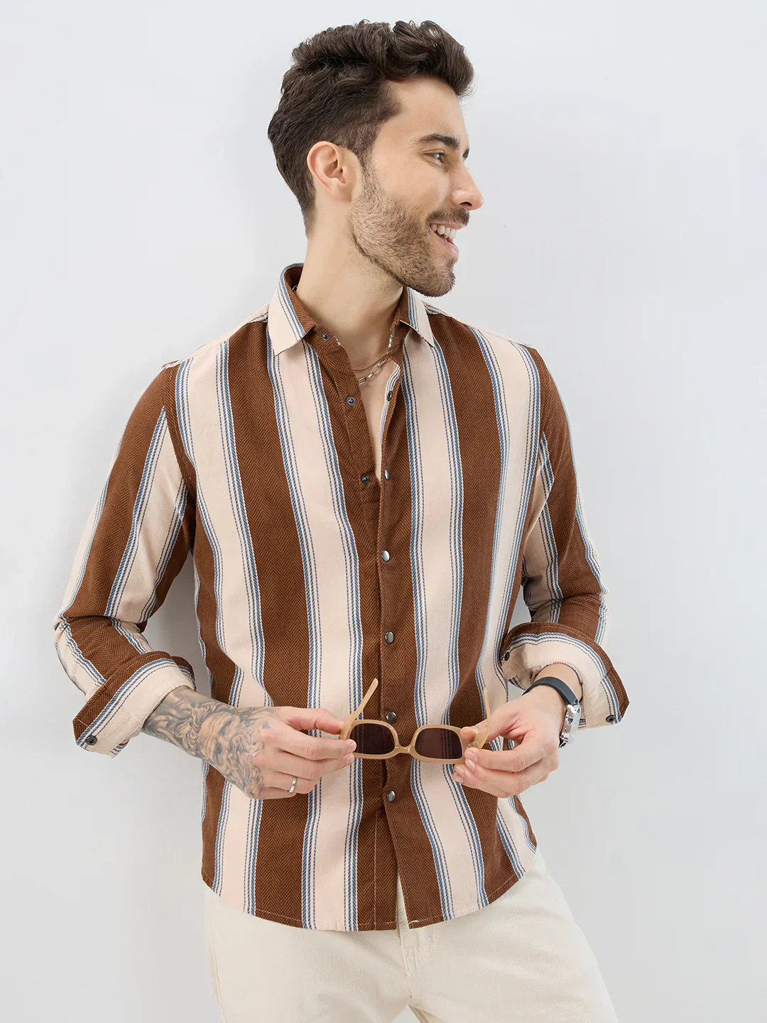 Step up your style game with this bold and modern striped casual shirt, designed for men who like to stand out effortlessly. Featuring a unique mix of brown and beige vertical stripes, this shirt adds a stylish edge to your everyday look.
