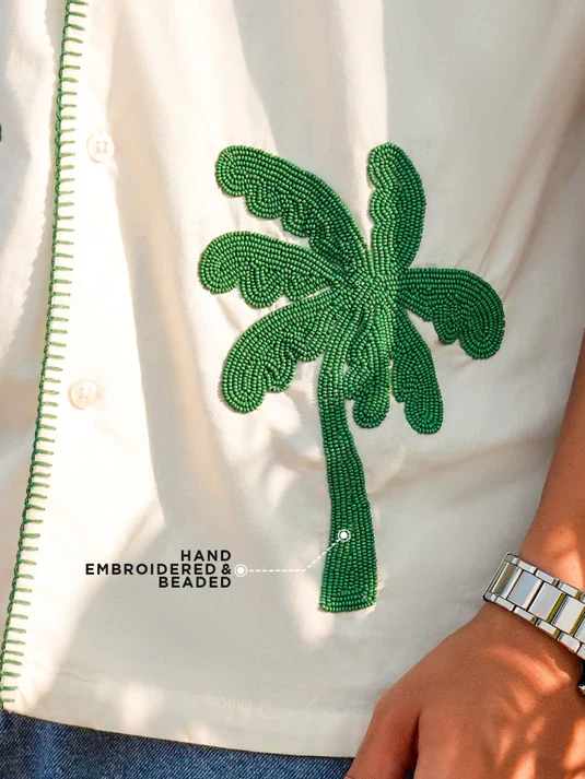 Features two bold green palm tree designs on the front with hand-applied beadwork for texture and shine. Blanket stitching along the collar, sleeves, and hem adds a handcrafted feel, while the clean cream back stays plain to balance the look. Part of the Summer Collection